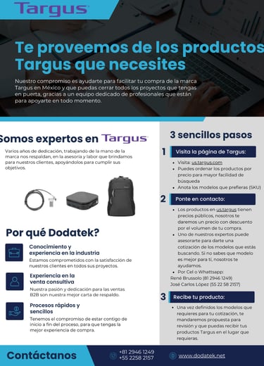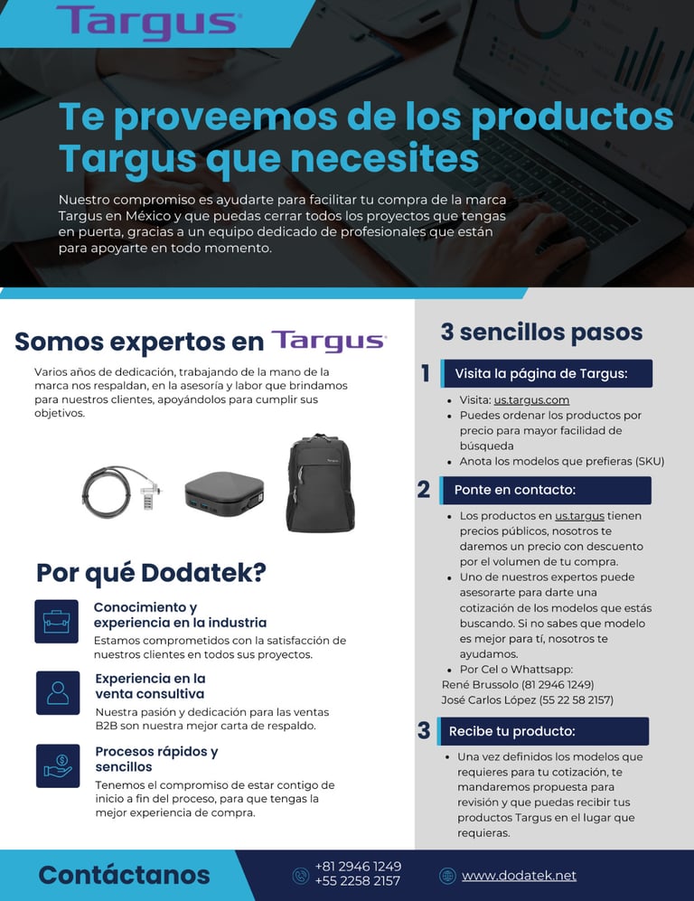 En dodatek.net, facilitamos tus compras de Targus en México, apoyándote con un equipo profesional dedicado a cerrar tus proyectos con éxito y a brindarte la mejor experiencia de compra.